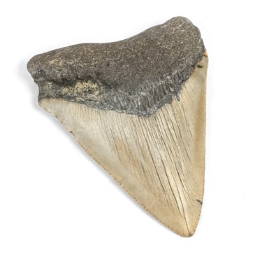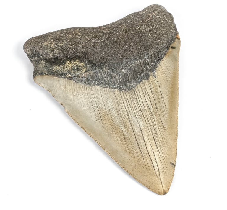 Authentic fossil Megalodon (Otodus megalodon) tooth recovered from South Carolina coastal deposits, dating to the Miocene–Pliocene epoch (23–3.6 million years old).