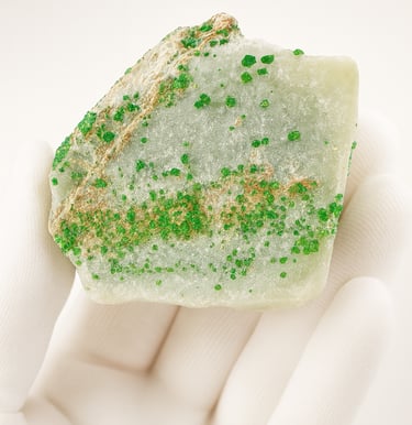 Rare Uvarovite garnet with vivid emerald-green crystals naturally set on a pale matrix. Among the rarest garnets, prized for its chromium-rich composition and intense color.